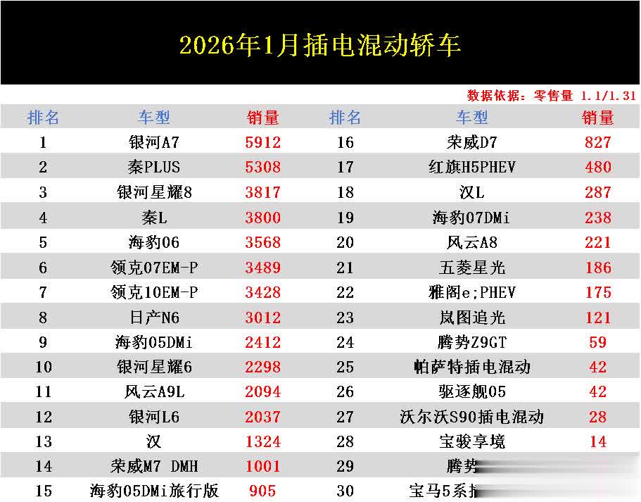 导读:日前,乘联会方面已正式公布了2026年1月份插电混动轿车销量排名,而翻看完这份销量数据,给人最直观的感觉就是,市场排名又大变天了!在榜单前三十名里面,竟然无一款月销量突破万辆大关,整体销量下滑十分明显,排名也已大洗牌了。曾经比亚迪一家独大的局面已不复存在,吉利品牌旗下的车型则强势崛起了,其中吉利银河A7以5912辆的销量力压群雄成功登顶榜首,同为吉利品牌的银河星耀8也都跻身榜单前三名。另一边,比亚迪品牌旗下的老面孔车型则显得较为低迷,比如秦PLUS、秦L、海豹06等排名虽然都比较靠前,但环比上个月销量下滑十分显著,月销量都在5308辆以下,海豹05DMi、汉等也都不及预期,月销量双双跌破3千辆。1月插电混动轿车太惨了!无1款破万,银河A7夺冠,秦L第4,汉第10