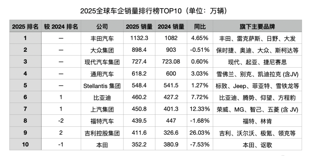 近日2025年全球车企销量排行榜前十座次正式落定 。对于全球汽车产业而言,这是一张实力更替的榜单:既有丰田、大众等传统巨头稳固的“守擂”,更有中国汽车军团史无前例的集体上攻。