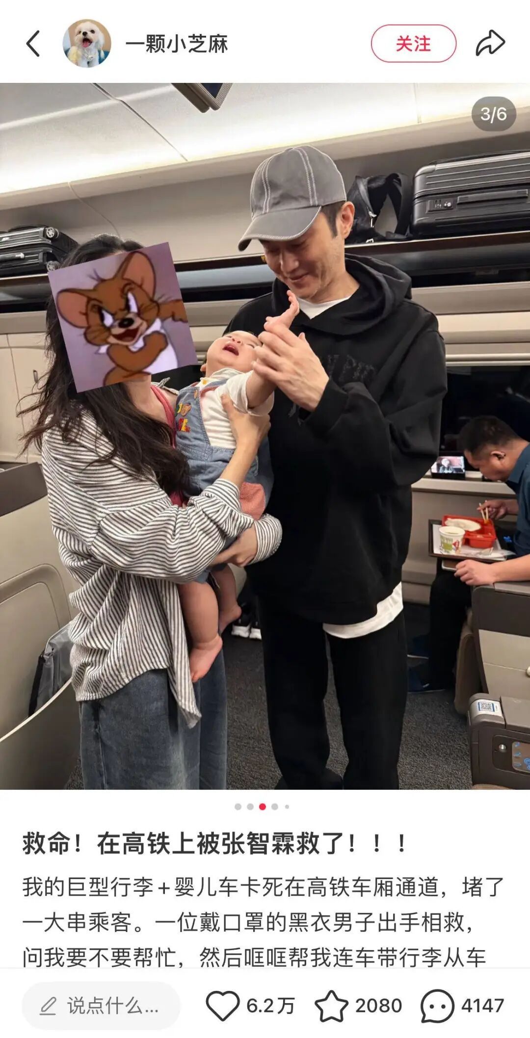 发车之后,这位网友想要感谢帮助自己的人,“行李巨重……我想要不要给他转个感谢小红包或者请他喝饮料的时候,他把口罩摘了……”网友发现,他竟然是张智霖!
