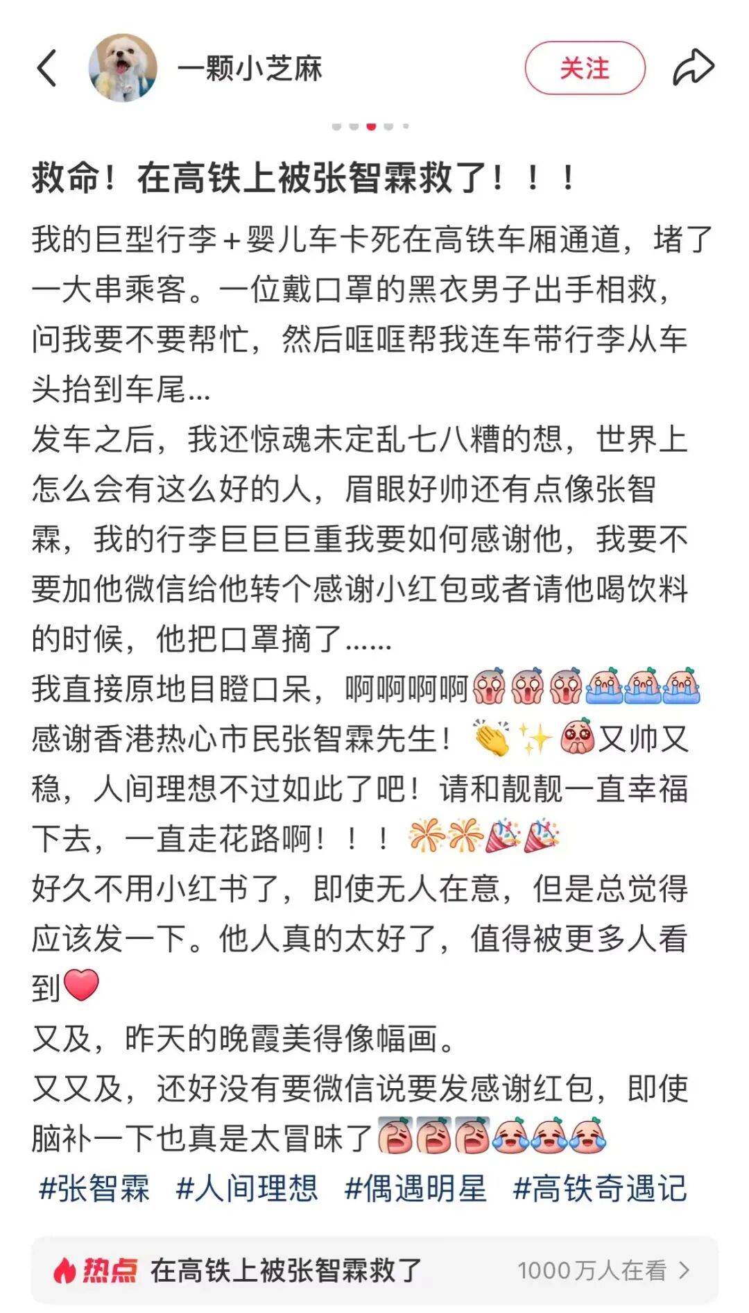 对于“香港热心市民”的举动,网友开玩笑:“在高铁卡行李……可以遇到张智霖!”“不坐一等座没有这么好的运气!”还有网友发声:“奖励张智霖买10只爱马仕给靓靓!”