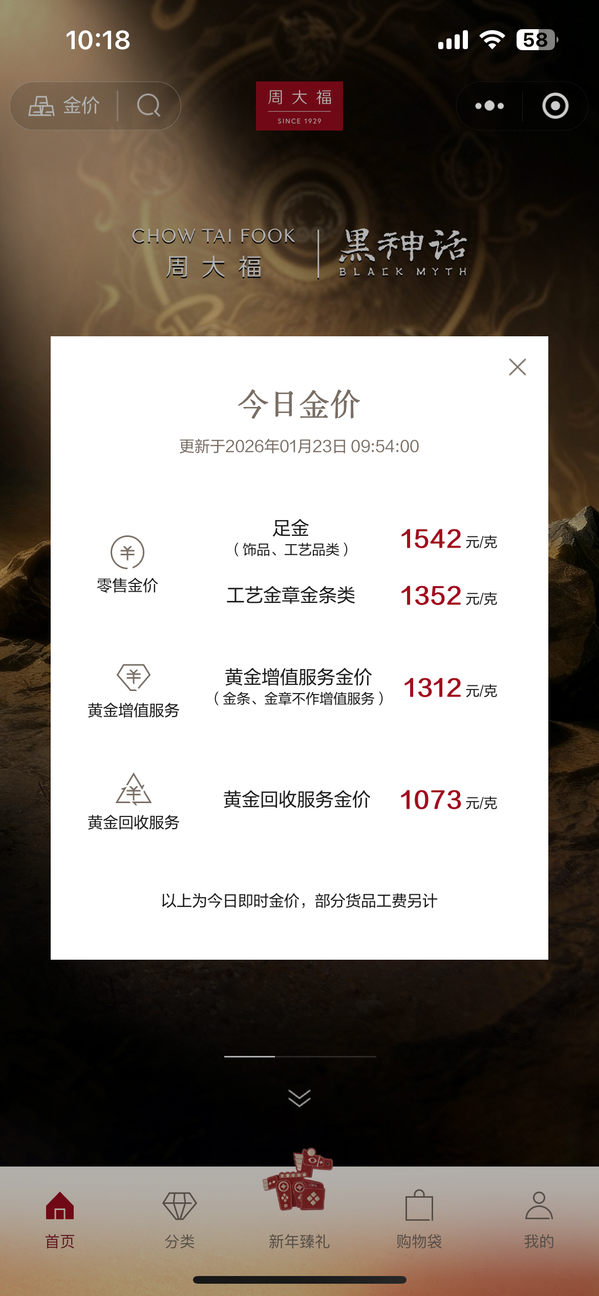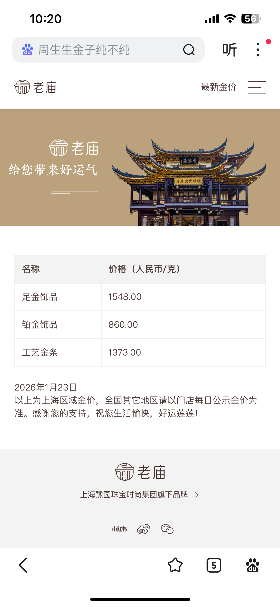 1月23日,上游新闻记者查询发现,国内多数知名金饰品牌报价突破1500元/克。其中,周大福足金饰品克价为1542元,周生生足金饰品克价为1545元,老庙黄金足金饰品当日克价为1548元。